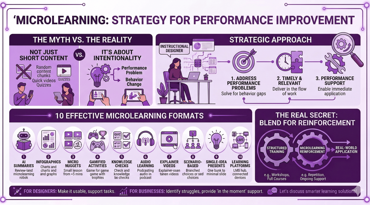 As an Instructional Designer, I’ve seen organizations turn microlearning into random pieces of content. Quick videos here, a short quiz there, without a real learning strategy behind it.